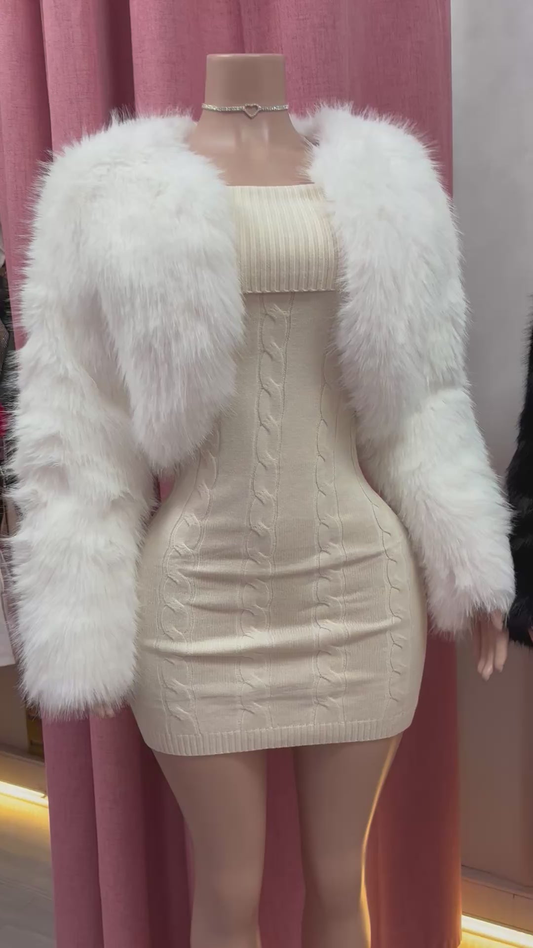 Abrigo corto peludo que envuelve con suavidad y lujo, perfecto para una cita o una ocasión especial. Es abrigador sin opacar tu outfit: lo realza con ese toque sofisticado que enamora a primera vista.