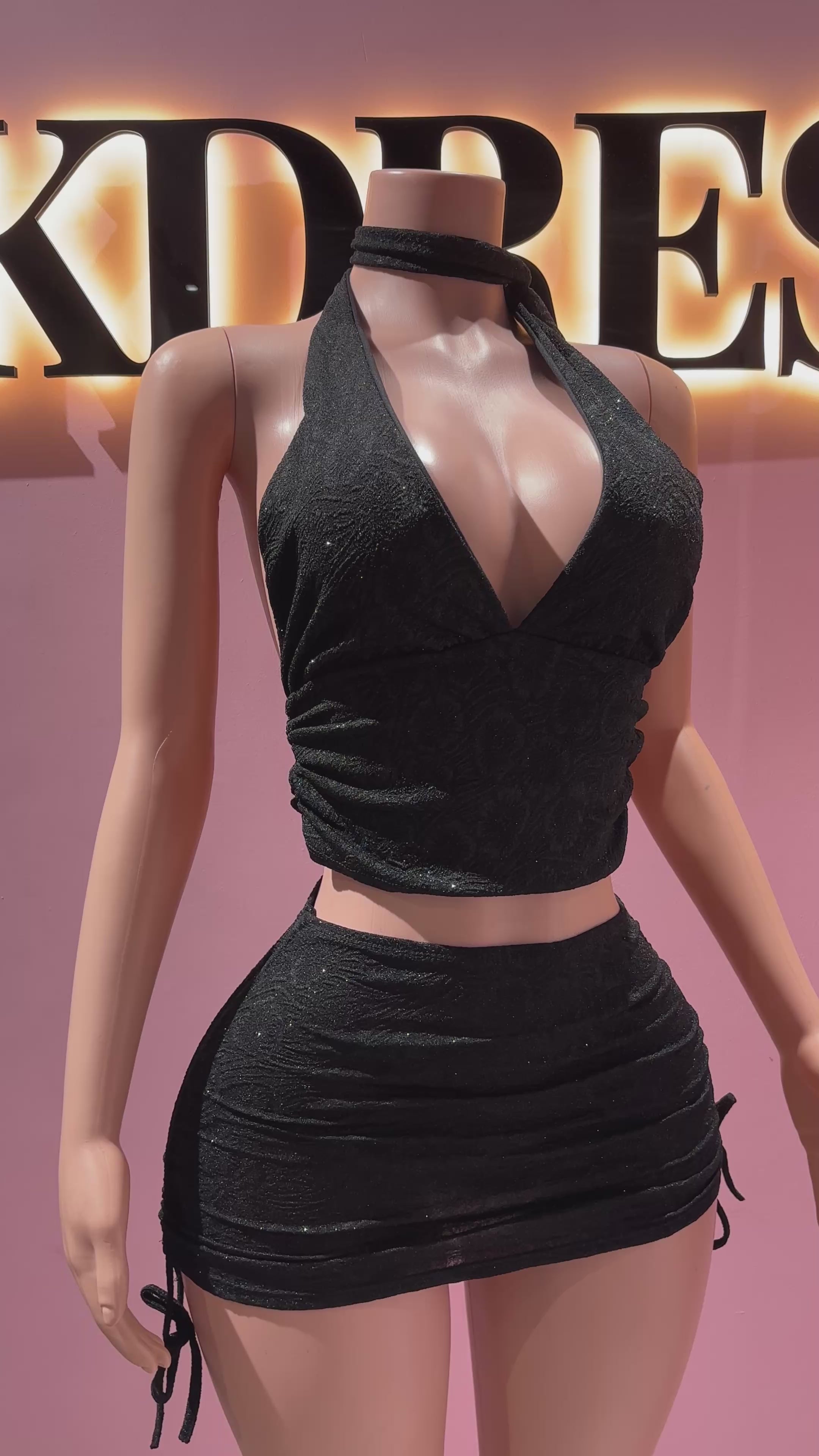Top de escote que realza el busto y aporta ese toque sensual perfecto, combinado con una falda que moldea y estiliza. Su tela con brillo capta la luz en cada movimiento, ideal para carretes, fiestas y noches 🌙